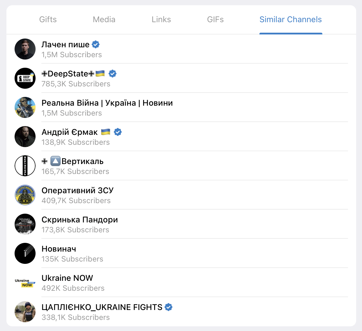 Take the official Telegram channel of President Zelenskyi: its “similar channels” include some of Ukraine’s most popular news channels, the channel of the head of the Presidential Office, or “Vertykal,” a channel affiliated with the Office. These are the channels most frequently followed by Zelenskyi’s subscribers.
